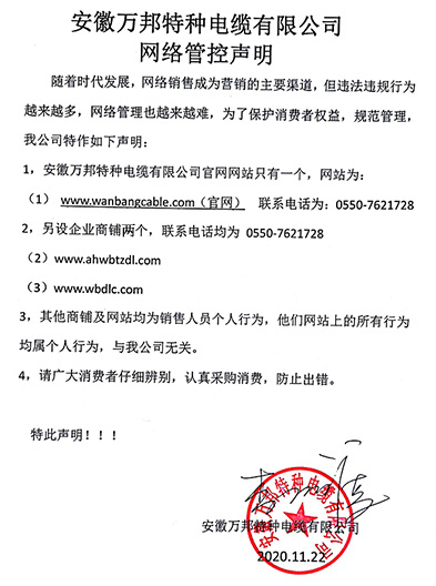 鄭重聲明:安徽萬邦特種電纜有限公司官方網站為:www_wanbangcable_com.jptslno.cn,除此之外無任何子網站或合作網站,其余均為假冒偽劣。電話:0550-7621728 13485756353 地 址:安徽省天長市滁州高新技術產業開發區經四路29號